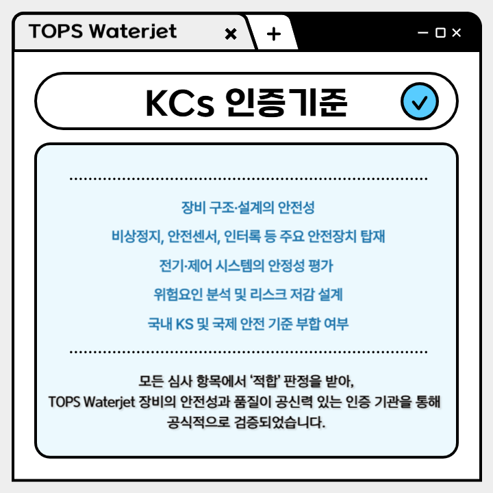 TOPS에서는 아래와 같은 모든 기준을 충족하여 KCs 인증을 받았습니다.